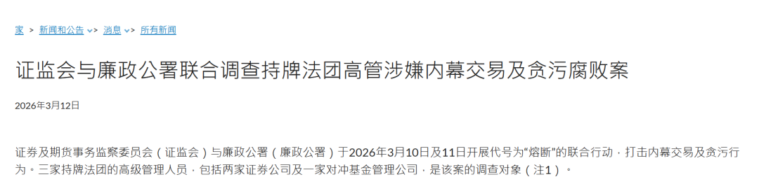 3月12日,香港廉政公署公告称,与香港证监会在3月10日及11日展开代号“Fuse”的联合行动,打击涉嫌内幕交易及贪污行为。2家证券公司与一家对冲基金管理公司及高管均为该案的利害关系人。